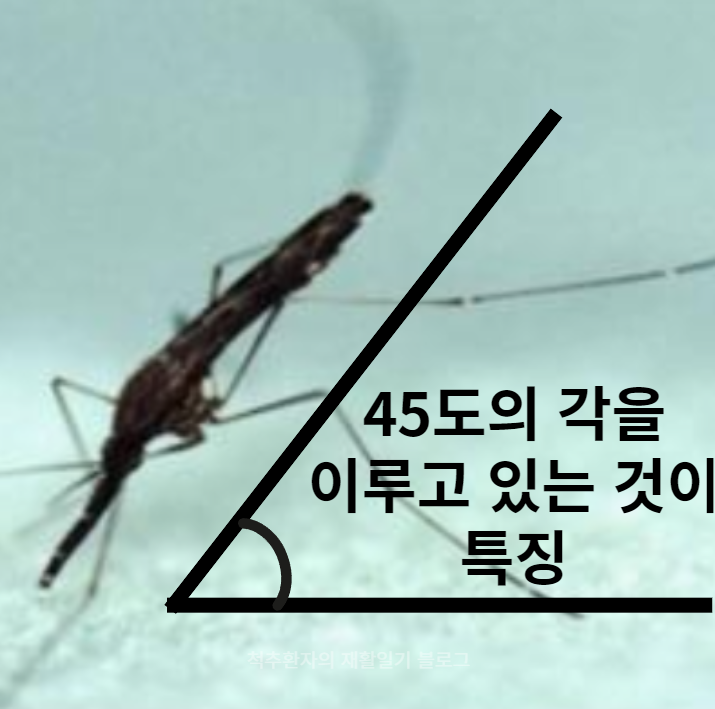 말라리아모기(중국 얼룩 날개 모기)들은 일반 다른 모기와 생김새가 다릅니다. 일반적인 모기들은 앉을 때 평행하게 앉지만, 말라리아모기들은 45도를 세워서 앉습니다.