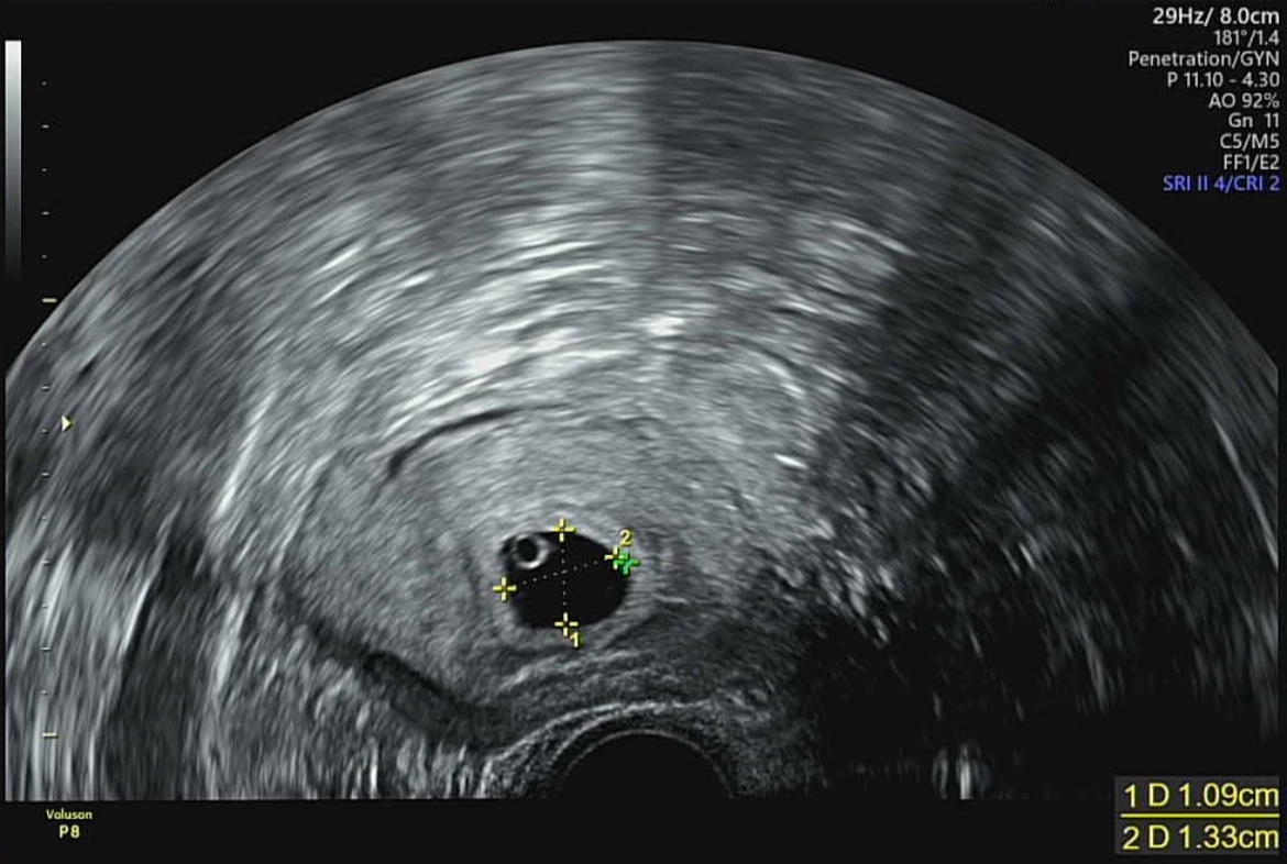 초음파상으로 확인 되는 형태는 하얀 자궁속에 까만 동그라미가 아기집이며, 그 아기집 안에 동그란 반지모양의 하얀색 텅 빈 동그라미가 난황입니다. 난황은 태아가 탯줄을 통해 영양이 공급되기 전까지 임신초기의 태아에게 영양을 공급해주는 것을 난황이라고 합니다. 저희 산부인과 의사선생님은 간단하게 아기밥이라고 표현하였습니다.